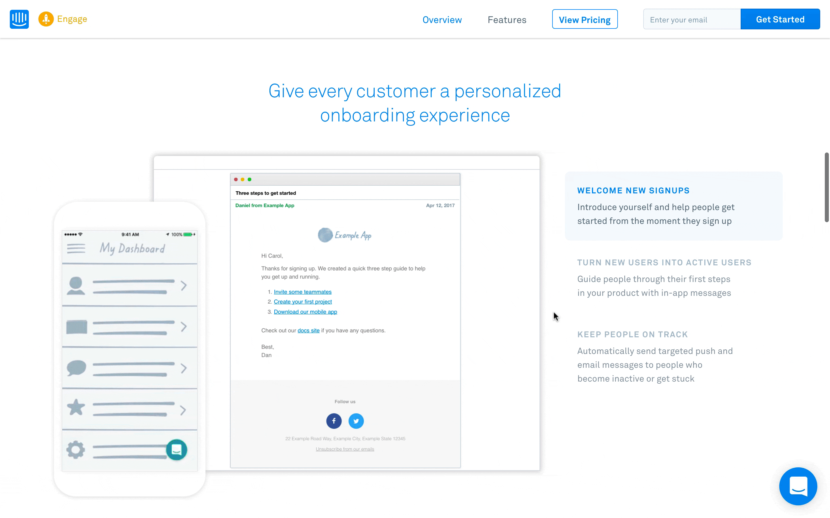 The “key features” are the must-haves. These are the features that are essential for your product to get the job done and, in some cases, differentiate you from your competitors. On the landing page for Intercom’s conversational customer engagement solution, we show the different types of tools you can use to onboard and activate customers – rule-based campaigns, in-app messages, interactive tours.