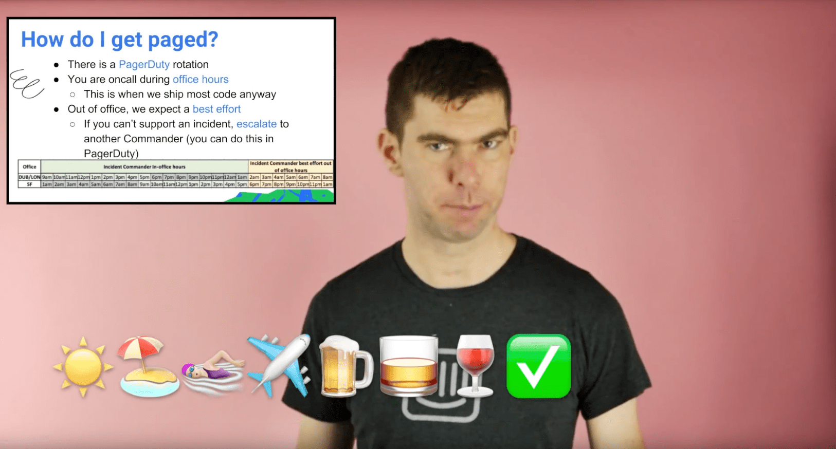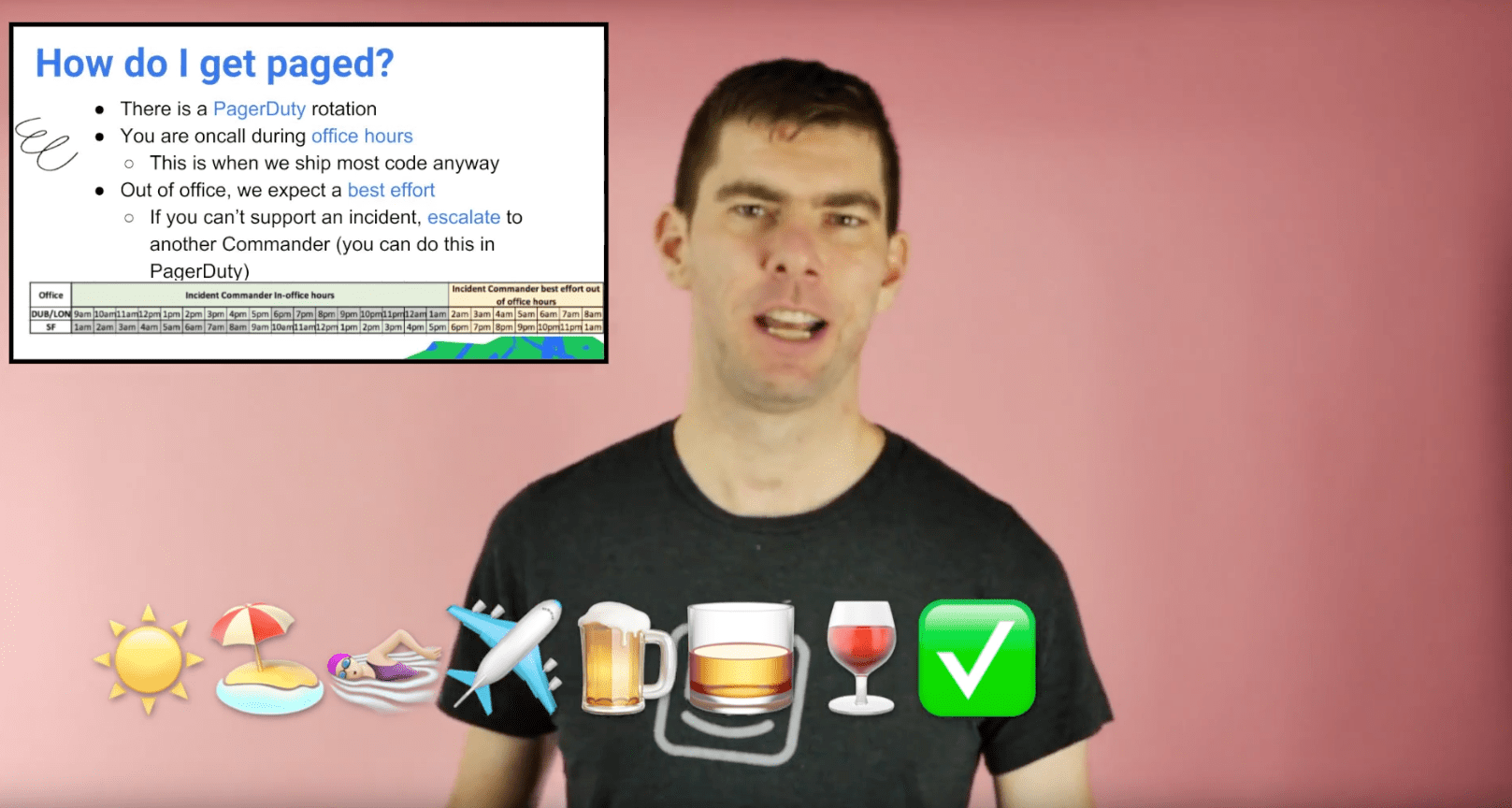 The documentation we’re most proud of is a fun training video we created for people who are interested in being an Incident Commander. We trained four commanders in both our Dublin and San Francisco offices and set up a PagerDuty rotation that aligns with our office hours, since that’s when most of our incidents occur. But we also wanted to democratize the process and make sure everyone had access to our incident management tools and resources.
