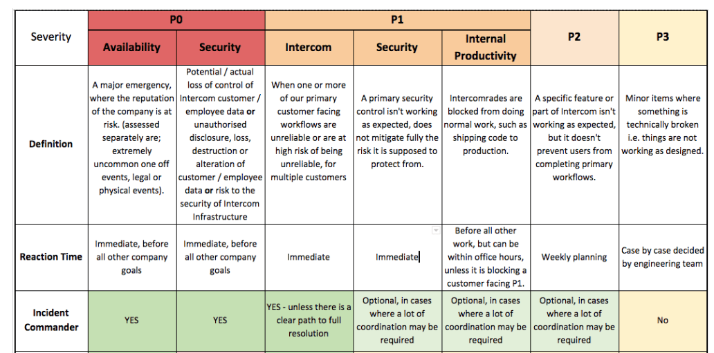 We also worked to clearly classify the severity of incidents. For example, some of our team had an incorrect assumption that a P0 was always security related, so we invested in education on this in addition to providing more examples of what we classify as P0 (a large event that puts the public reputation of the company at risk) through to a P3 (a minor defect or bug that should be fixed). We further offered guidelines on how something is escalated from a P1 to a P0 (such as extended incident duration, or catastrophic customer impact such as data loss), which helps in especially complicated situations.