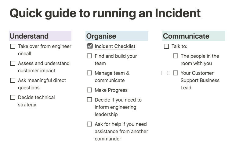 Firstly, we introduced a formalized Incident Commander role. In times gone by, we generally did have somebody managing the event, but this was done informally and without explicit responsibilities. With an Incident Commander, we now have someone who can act as a single source of truth and take responsibility for managing the technical resolution of the incident, end to end. This was not a role that we invented out of thin air. It’s a commonly used role across our industry (and beyond), though with a variety of different titles and responsibilities.
