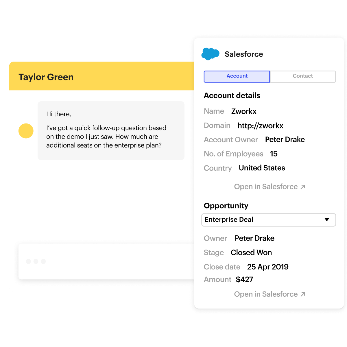 Plus, with the Salesforce app, you can create the lead in Salesforce with one click. Or, if the lead exists already, you can see their account, opportunity and contact details – all without opening a new tab. This means you can respond to your lead in seconds with the benefit of having all of the context right in front of you.Salesforce App Intercom InboxHaving identified them as a promising lead and responded quickly with the right information, you can now focus on what’s most important, getting them on a demo or sales call ASAP. Scheduling apps like Calendly and Google Calendar make it easy for your lead to book time with you, right inside your conversation. Or, you can hop on a call right away with Google Meet, Aircall Now or one of our other video or phone call apps. Your pipeline has never been smoother.