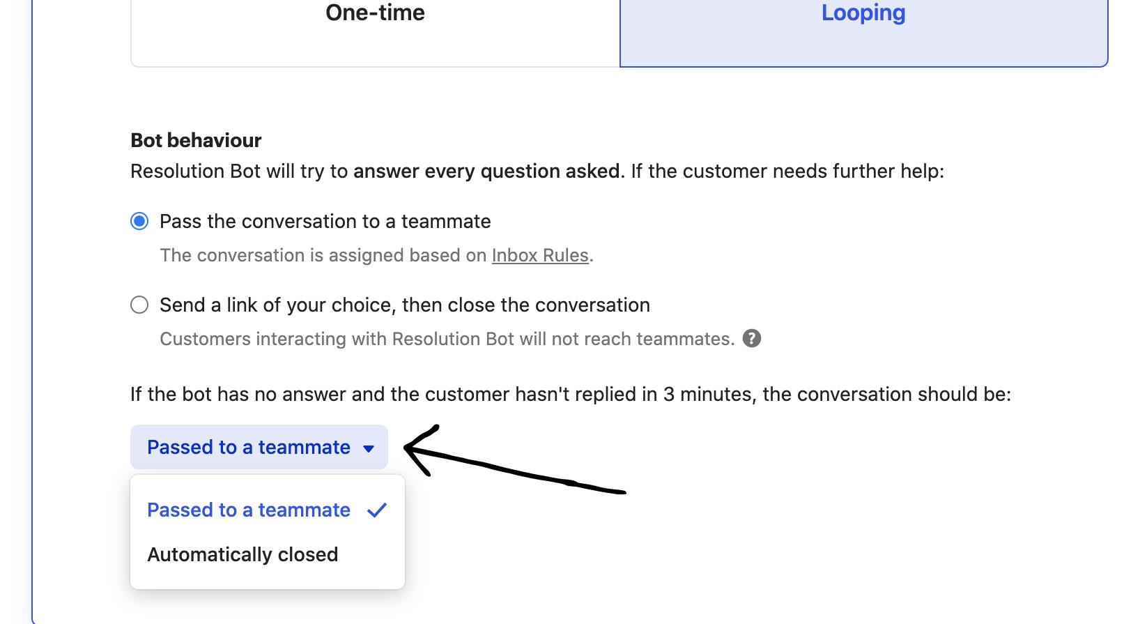 3. Auto-close option (Looping only)- If a conversation has been inactive for 3 minutes or more, customers can choose to either automatically close a conversation or route it to a team member. The default setting will be to route to a team member, but you can update this in Operator settings.